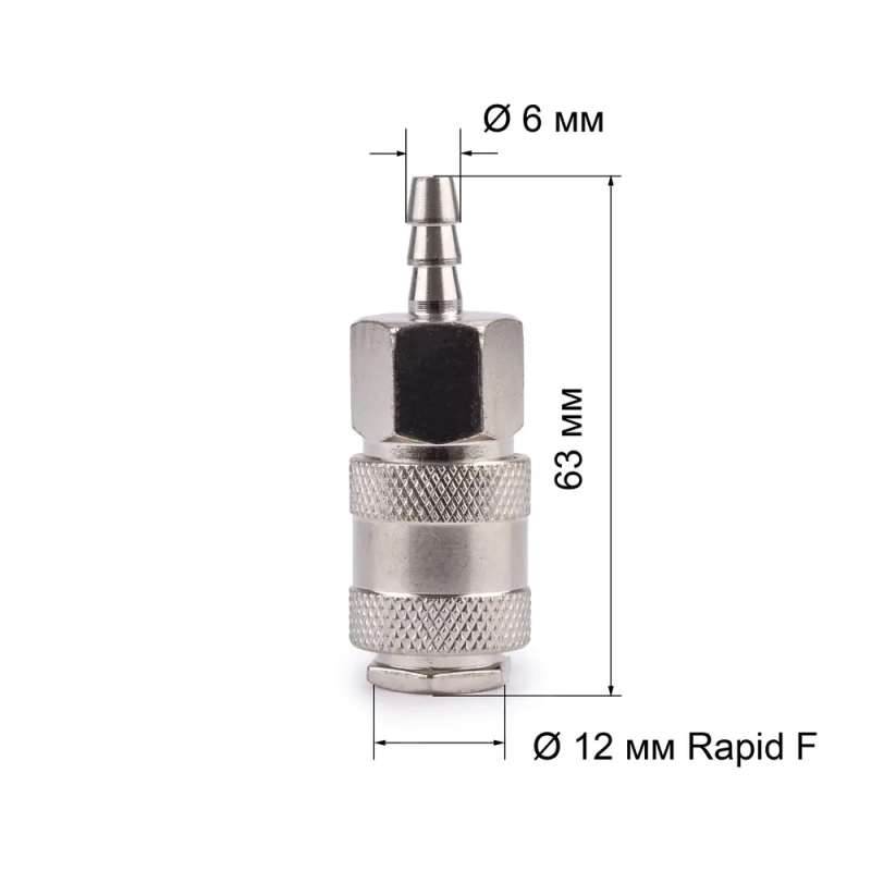 Соединитель Rapid F «мама» — елочка 6 мм подходит для быстрого подключения воздушных шлангов к пневмоинструменту или компрессору и обеспечивает качественное и герметичное соединение.