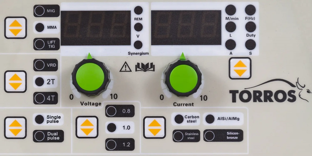 Полуавтомат Torros Mig-200Pulse (M2004) имеет такую полезную вещь как синергетическое управление, что позволяет настроить параметры сварки без особых навыков при помощи одной рукоятки. Синергетическое управление полуавтомата значительно экономит время как новичку, так и профессионалу - оператору необходимо выбрать тип и диаметр сварочной проволоки под соответствующий защитный газ (СО2 или сварочную смесь Ar-80% + CO2-20%) и установить величину сварочного напряжения, а аппарат сам подберет оптимальные значения сварочного тока и скорости подачи проволоки.