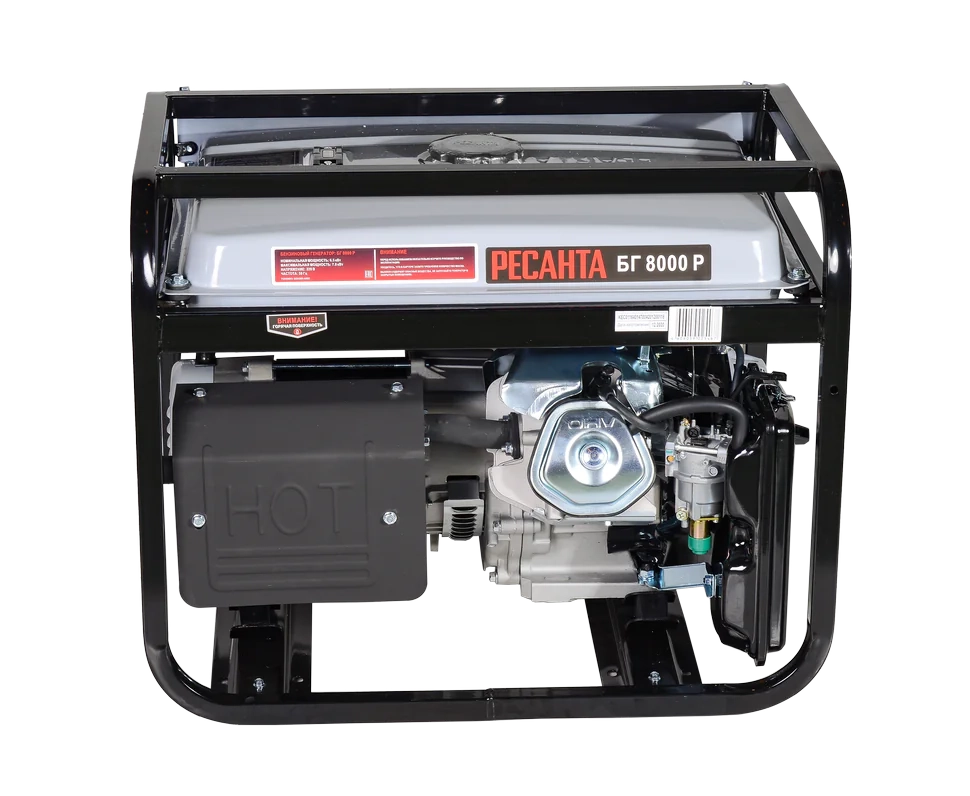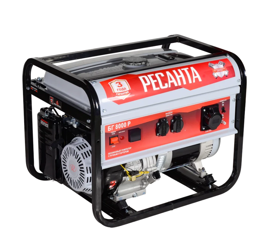 Электрогенератор (бензогенератор )Ресанта БГ 8000 Р - электрическая машина, предназначенная для автономного электроснабжения. В качестве первичного двигателя используется четырёхтактный карбюраторный двигатель, топливом для которого является неэтилированный бензин. Электрогенератор предназначен для получения электроэнергии в тех местах, где отсутствует магистральное электроснабжение. Это касается, как частных домов, где генераторы могут использоваться в качестве резервного источника питания, так и различных участков работ, где нужно электропитание для оборудования и проведения работ. Электрогенераторы РЕСАНТА обладают повышенным ресурсом и имеют гарантию 3 года. Генераторы отличаются высоким качеством, надёжностью и оснащённостью.
