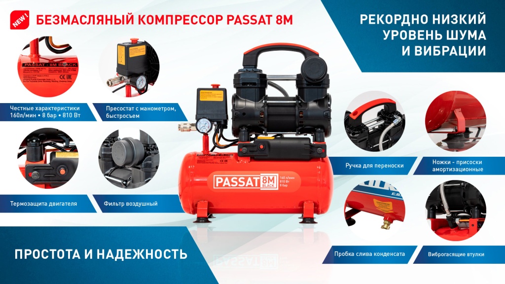 PASSAT BLACK – линейка поршневых безмасляных компрессоров со сниженным уровнем шума и высокой производительностью. «Сухие» компрессоры PASSAT будут востребованы в быту, в небольшой мастерской в медицине или на пищевом производстве. Спаренные блоки цилиндров, установленные по двум сторонам электродвигателя, делают систему сбалансированной, снижают уровень вибрации и шума.