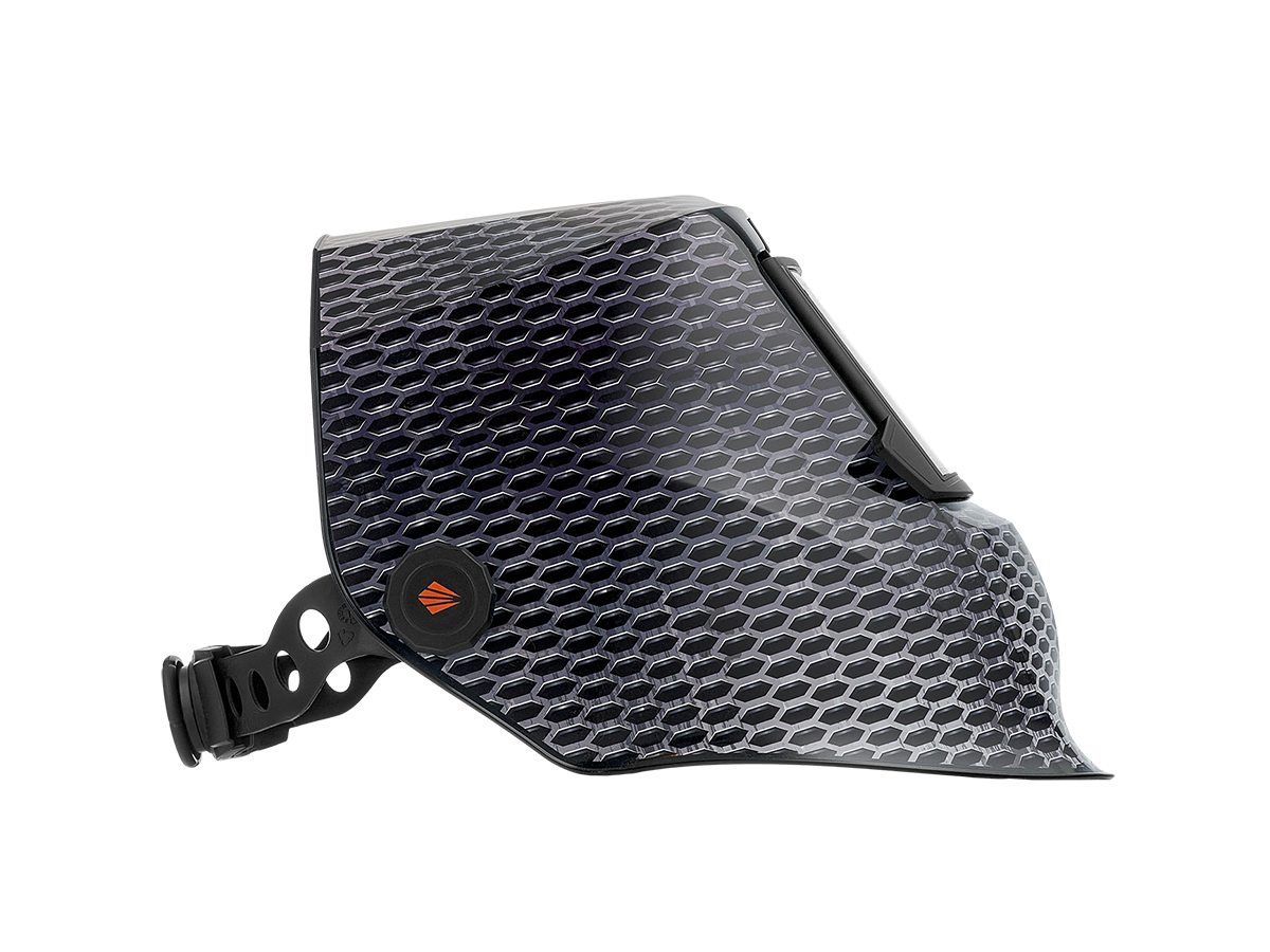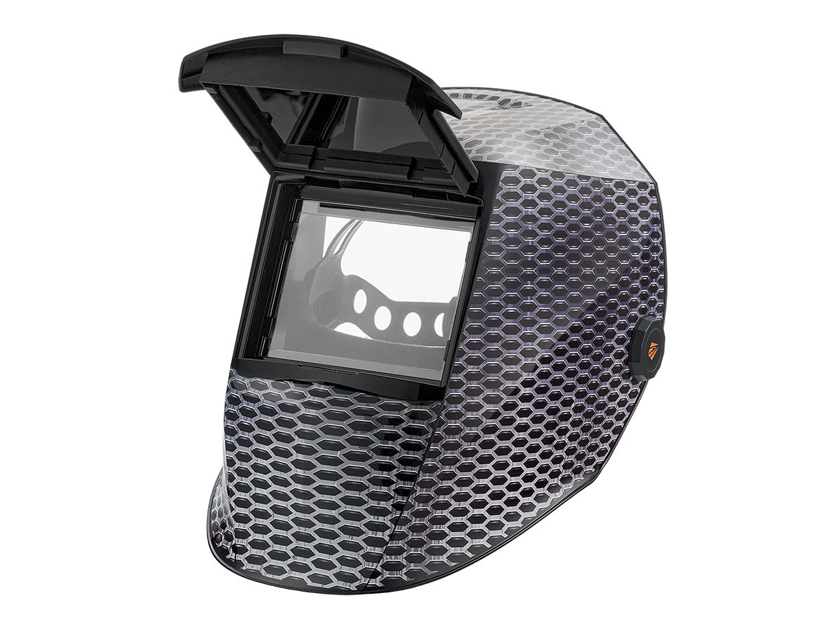 - Поликарбонатная защитная пластина защищает лицо и глаза от искр при поднятом экране.