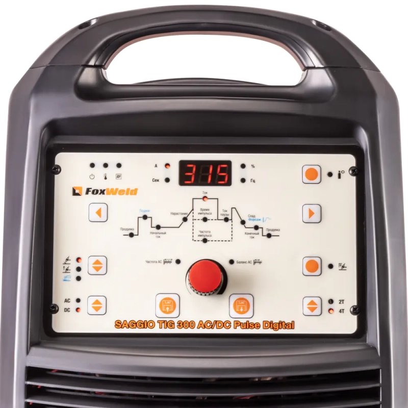 Удобная и очень простая, но, с другой стороны, наглядная и понятная система индикации, с мощнейшим набором функционала аргонодуговой сварки, с трёхфазным питанием и с очень большой мощностью сварочного тока в 315 Ампер – это Foxweld Saggio TIG 300 AC / DC Pulse Digital.