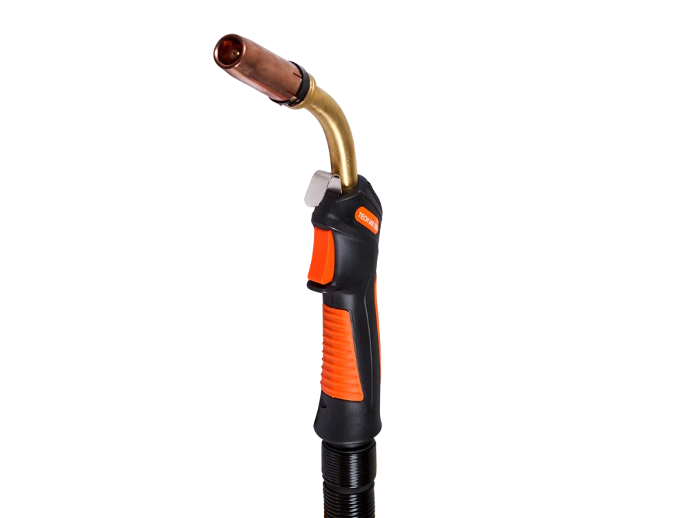 соединение между рукояткой и металлической пружиной. Надежная металлическая пружина исключает перегибание кабеля и обеспечивает более плавную подачу проволоки в любом положении горелки.